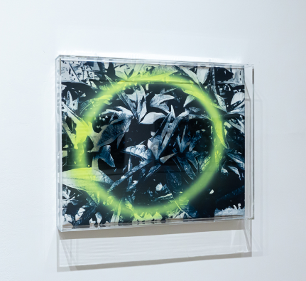 Untitled (White Flowers Diptych), 2021, white UV acrylic gold spraypaint on reflective mylar, on panel, framed in plexiglass, 18 x 48 in.