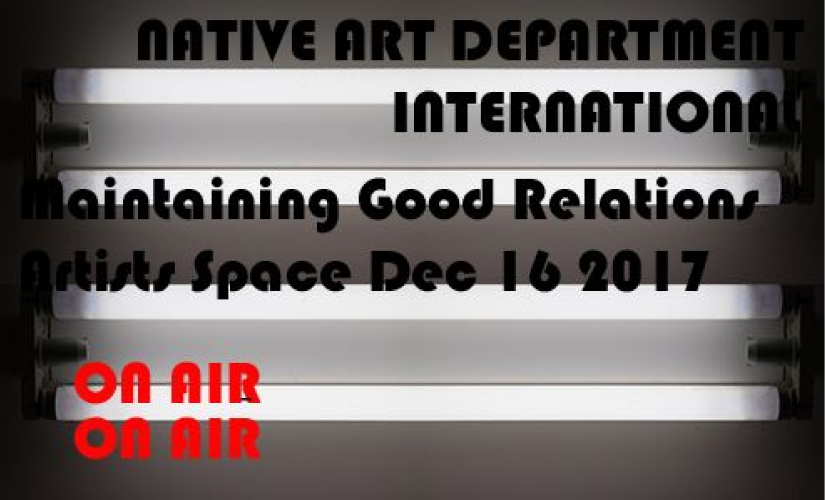 Maintaining Good Relations is a daylong live audio broadcast that will seek to emancipate listeners from their desire for consumable identities. On location at Artists Space, Native Art Department International will invite guests for live interviews and conversations, and review and critique art exhibitions, discuss news and current events, and play music. The book No Reservation: New York Contemporary Native American Art Movement will be available for sale.