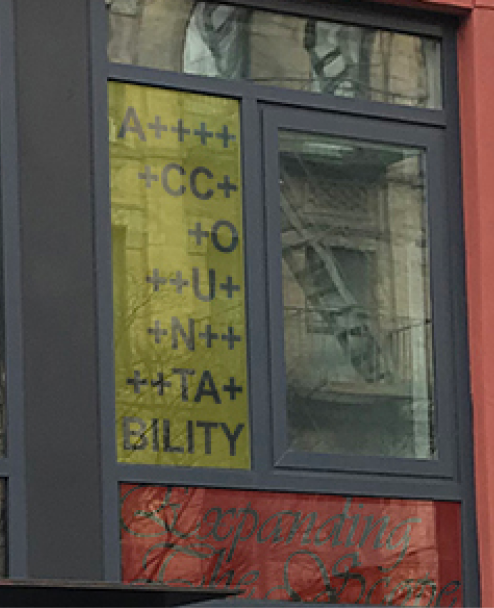 Installation work in the F.A.B building: Expanding The Scope (window film) and Signal Boost (plank on shelving)