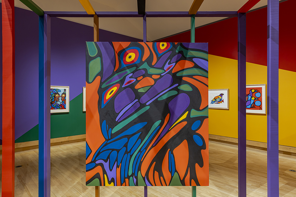 The painting Woodland Boogie Woogie 6 exemplifies their collaborative work, which sees each artist taking turns to contribute to the large colorful abstract painting included in this exhibition. Their inspiration, and the name of their series, stems from the Woodland School of Art. The Woodland School’s approach was founded by Norval Morrisseau of the Anishinaabe Nation and taken up by other First Nation artists from the Great Lakes Region in the 1960s and 1970s. The style merged traditional imagery with elements of modern art and is defined by bold saturated colours and black curvilinear outlines. Focusing on the key aspects of the style, NADI abstracts the iconic colours and forms used by the Woodland School, in order to expand the visual language and continue the cultural conversation.